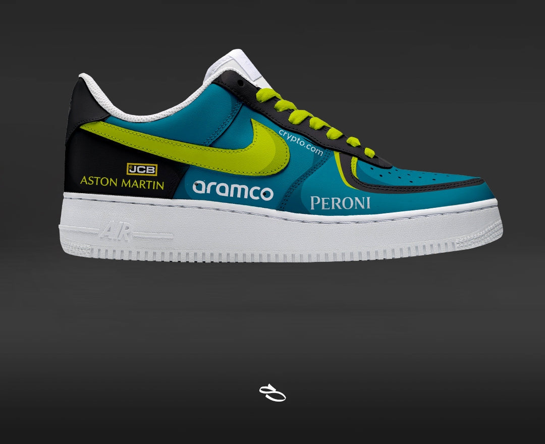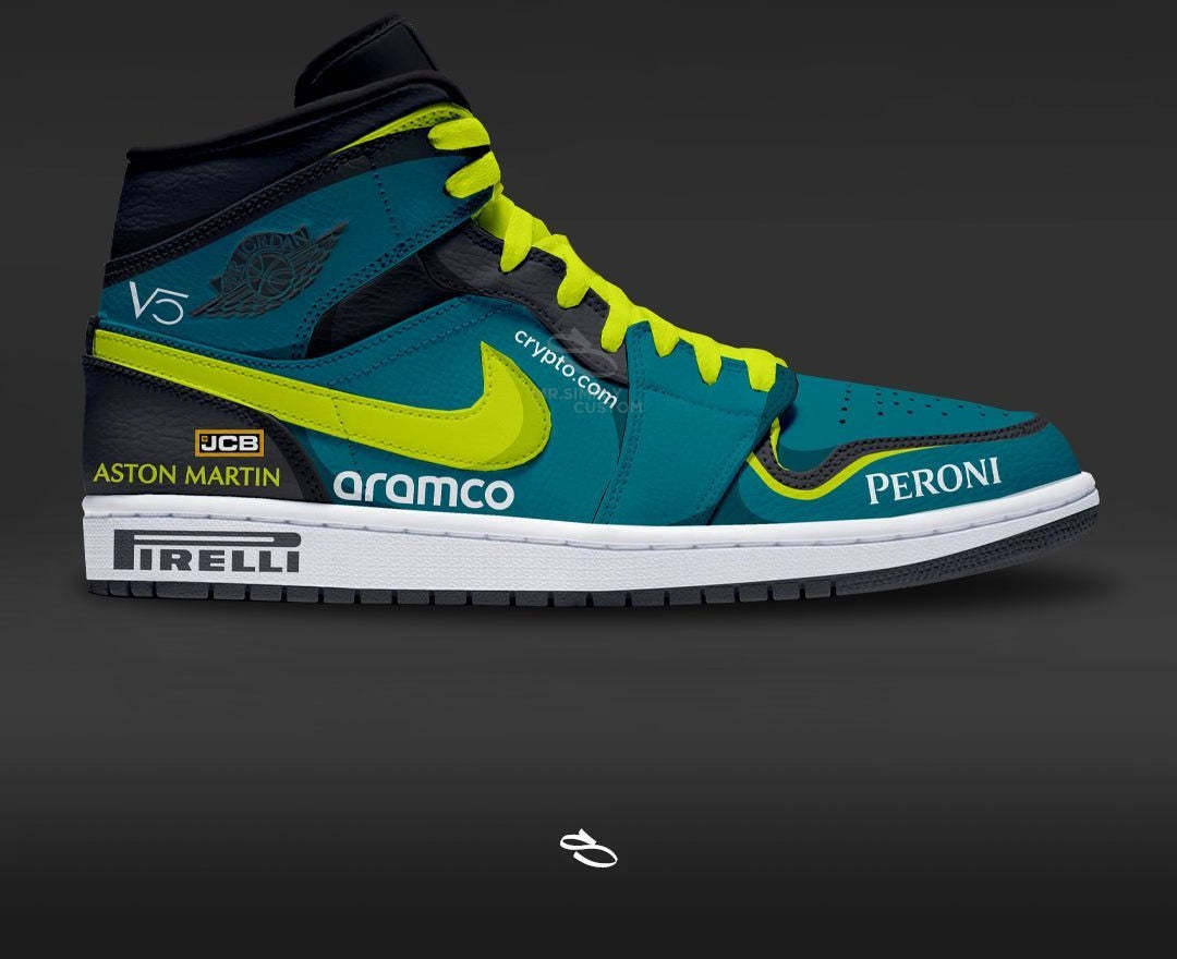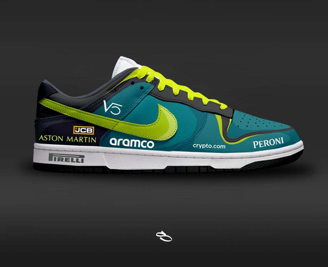 Introducing the F1 ASTON MARTIN PETRONAS - a unique and stylish custom design of the classic Dunk low & Aithtr Jorthtdan 1. With intricate details inspired by the popular F1 LIVERY, this shoe is sure to make a statement. Enjoy the comfort and functionality of Nike while proudly displaying F1 ASTON MARTIN PETRONAS