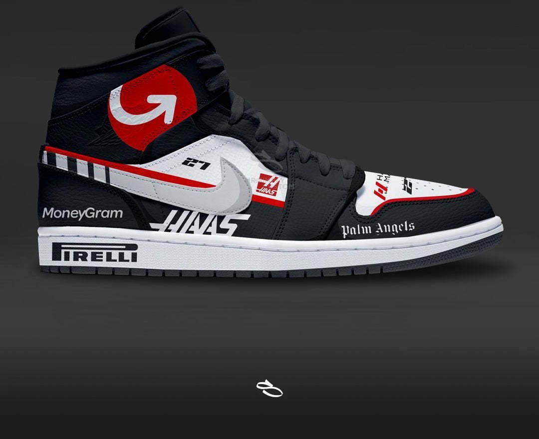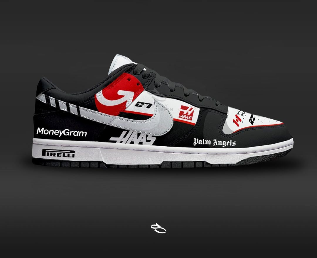 Introducing the F1 HAAS - a unique and stylish custom design of the classic Dunk low & Aithtr Jorthtdan 1. With intricate details inspired by the popular F1 LIVERY, this shoe is sure to make a statement. Enjoy the comfort and functionality of Nike while proudly displaying F1 HAAS.