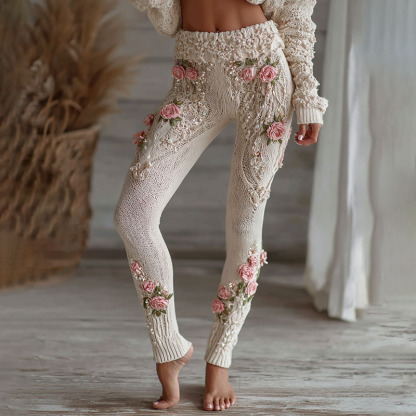 Women's Vintage Pink Floral Art Cozy Knit Leggings